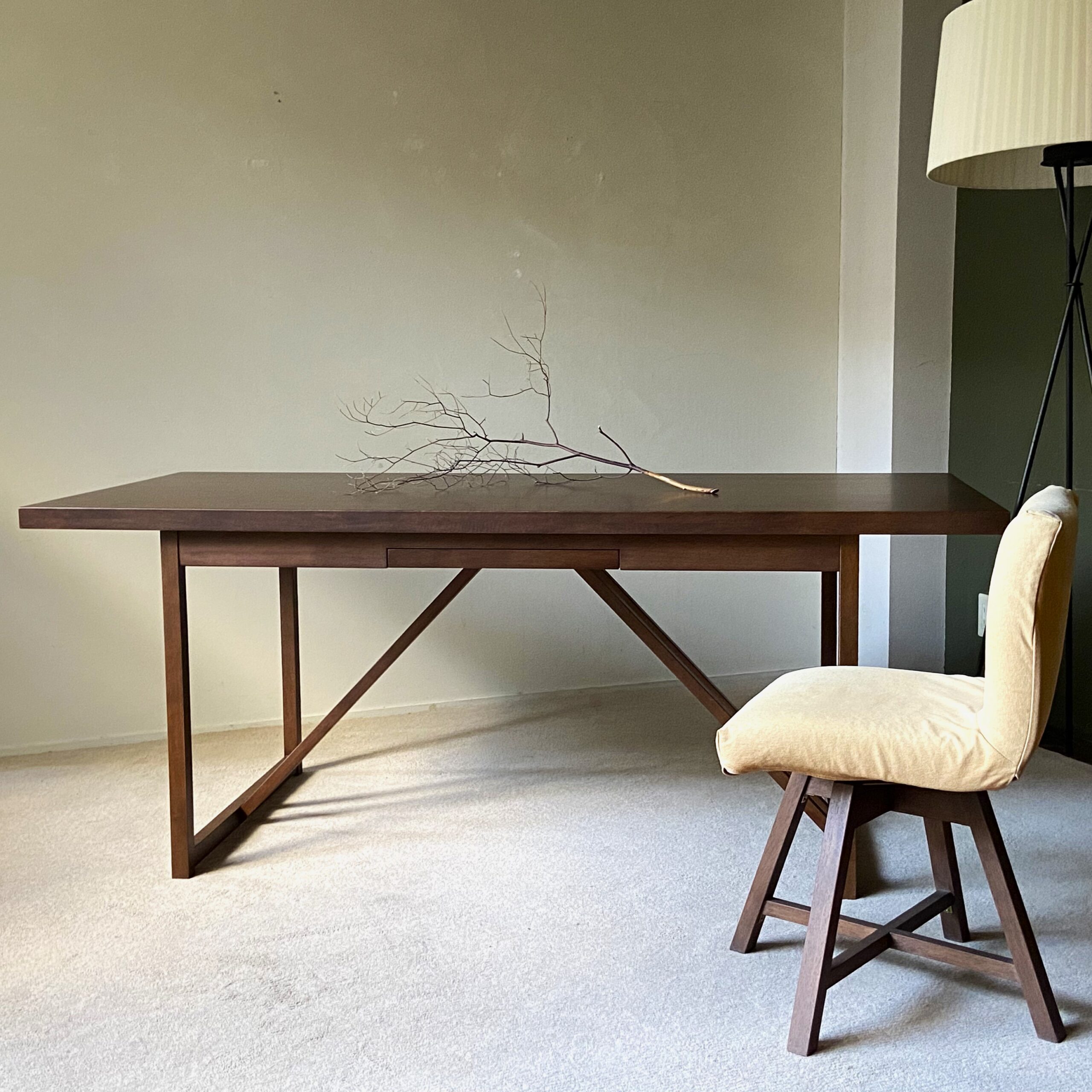 Calm color of Siam mahogany material that allows you to relax naturally, and the legs are unified to 28mm material, and the reinforcement part that is diagonally crossed is combined to create a unique design. The depth of the table is 77 cm, and the design is slightly narrower so that it does not give a feeling of oppression to the room.