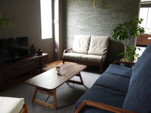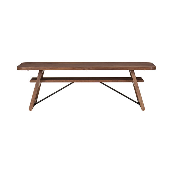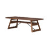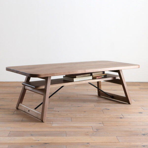 โต๊ะกลางทำจากไม้วอลนัท สีเป็นธรรมชาติ ออกแบบและเสริมด้วยเหล็กเพื่อให้รู้สึกแข็งแรง และดีไซน์มาให้เข้ากับได้ทุกห้อง