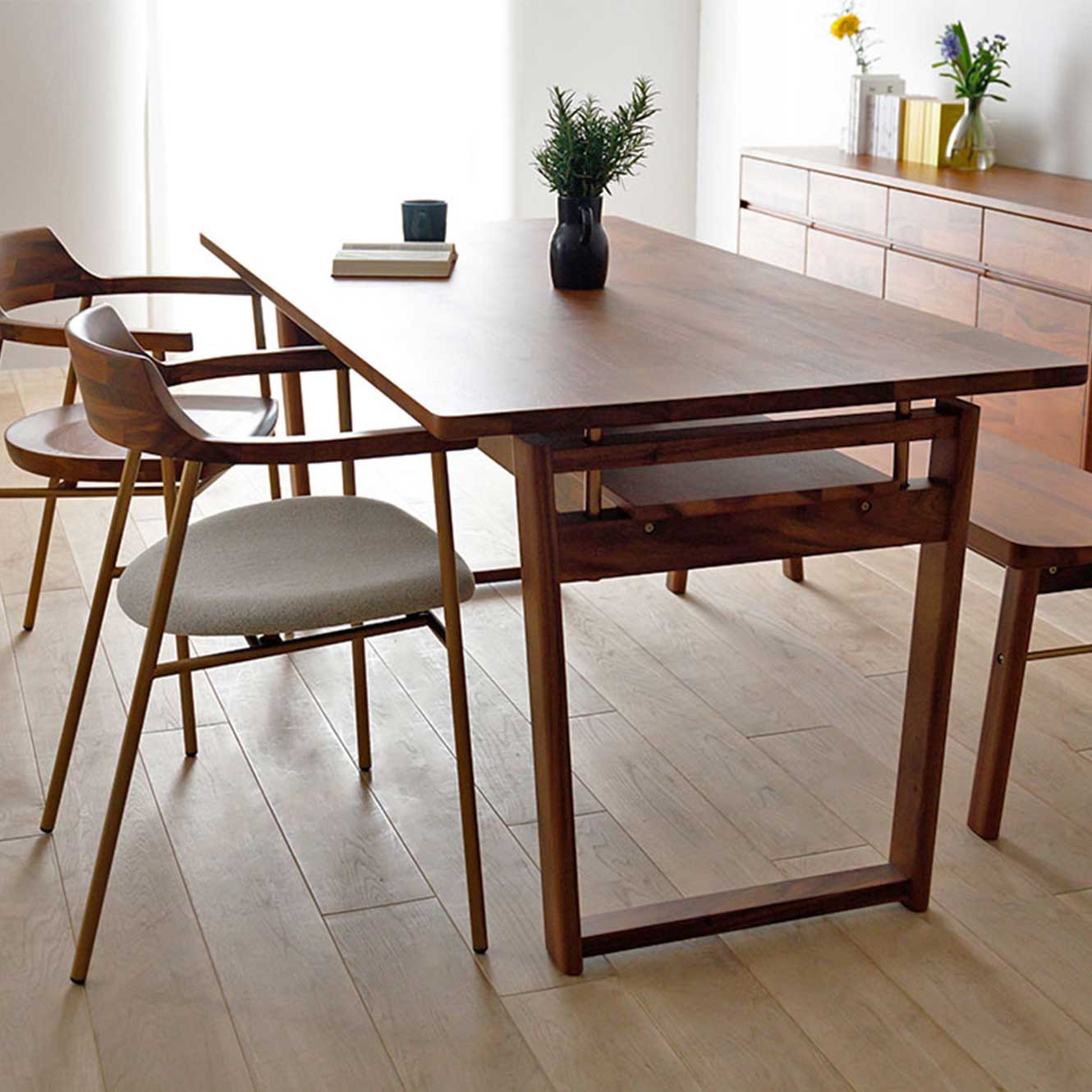 ด้านบนของโต๊ะอาหารและขาทำจากไม้จริง และส่วนประกอบบางชิ้นทำด้วยเหล็กเพื่อให้โต๊ะสามารถปกรับความสูงได้ตามความต้องการของสามาชิกในบ้าน และยังดีไซน์ด้านล่างให้มีพื้นที่วางของได้เพื่อความสะดวกของการรับประทานอาหาร
