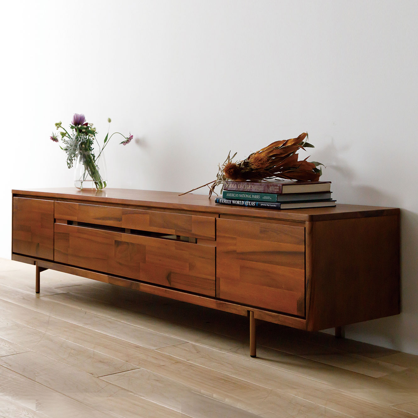 A beautiful and stylish TV board using laminated solid wood for the top plate and front plate.