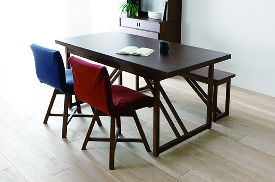 Calm color of Siam mahogany material that allows you to relax naturally, and the legs are unified to 28mm material, and the reinforcement part that is diagonally crossed is combined to create a unique design. The depth of the table is 77 cm, and the design is slightly narrower so that it does not give a feeling of oppression to the room.