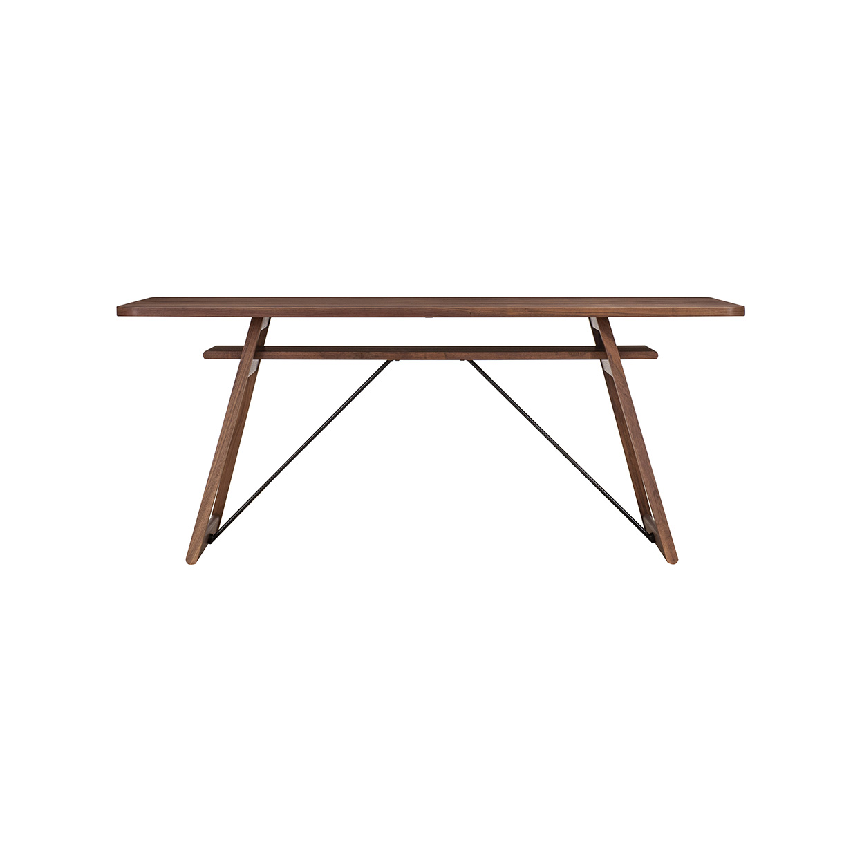 โต๊ะรับประทานอาหารทำจากไม้วอลนัท สีเป็นธรรมชาติ ออกแบบและเสริมด้วยเหล็กเพื่อให้รู้สึกแข็งแรง และดีไซน์มาให้เข้ากับได้ทุกห้อง