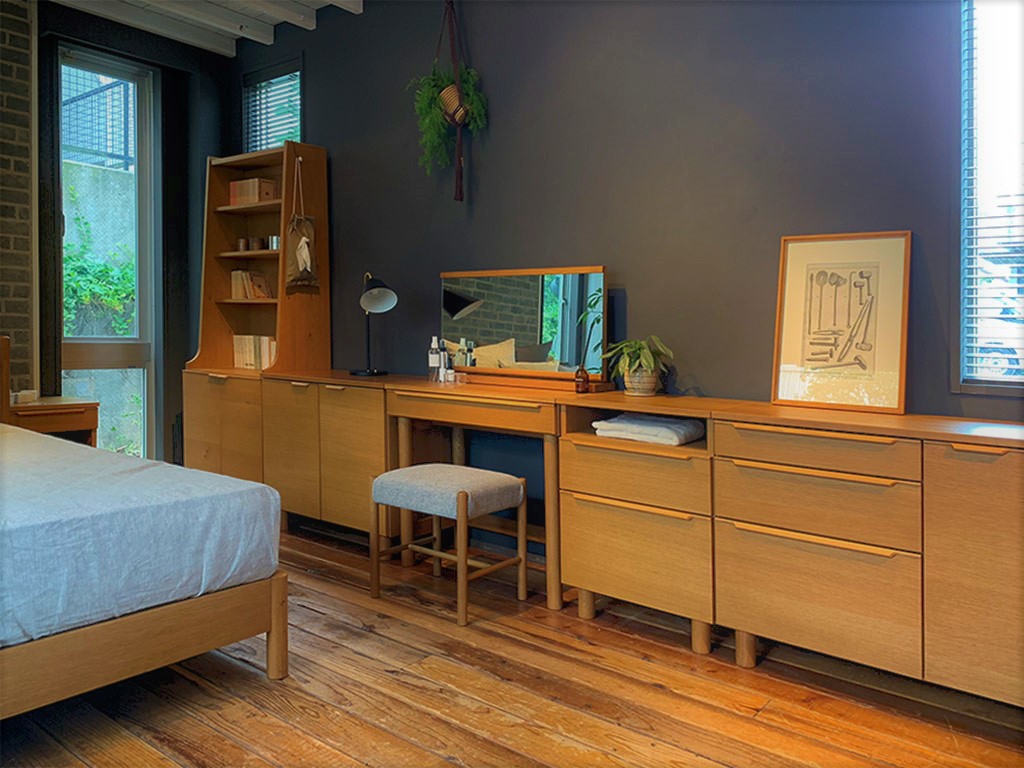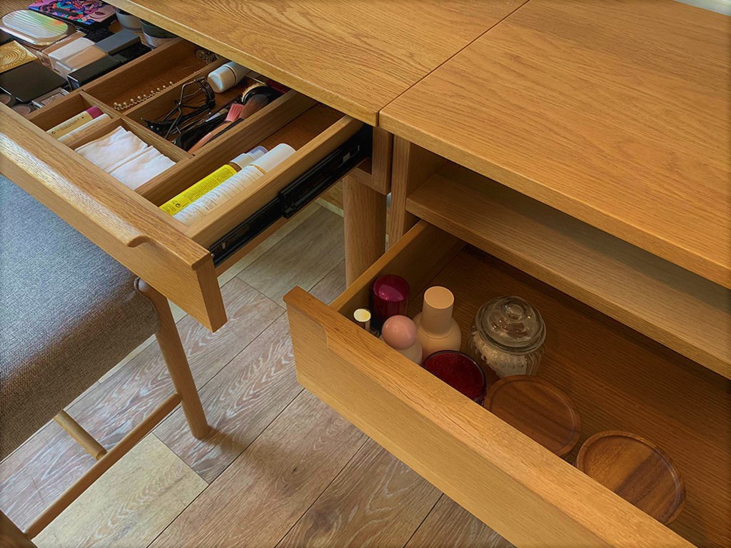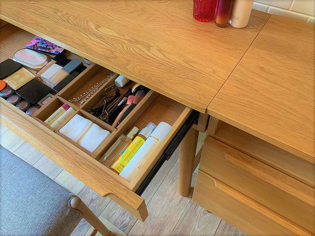 โต๊ะจะกลายเป็นโต๊ะเครื่องแป้งเมื่อรวมเข้ากับกระจกหรือหีบ และถ้าคุณเพิ่มหีบหรือกระดานที่ตรงกับจำนวนและสิ่งของที่จะจัดเก็บ คุณสามารถเก็บอุปกรณ์แต่งหน้า ขวด กระป๋องสเปรย์ ไดร์เป่าผม ผ้าเช็ดตัว เสื้อผ้า ฯลฯ .จะมีที่ว่าง.